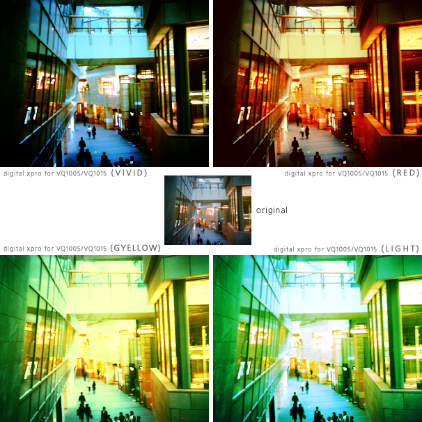 フィルムカメラではノーマル現像したものとクロスプロセス現像したものを比べるなんてできないわけですが、せっかくなので VQ1005 のオリジナルと 4 つのクロスプロセス効果の違いを用意してみました。
